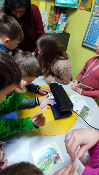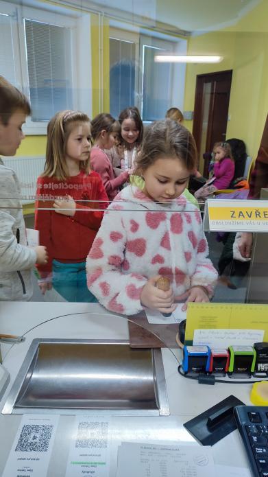 Další částí programu byla ukázka správného vyplnění balíku k odeslání. Děti se dozvěděly, že balík musí obsahovat údaje o odesílateli i příjemci, a naučily se, jak se balíky třídí podle velikosti. Nejvíce nás zaujalo povídání o bankovkách. Například jsme se dozvěděly, jak nevidomí poznávají hodnotu bankovek díky speciálním prvkům, nebo že bankovky jsou vyrobené ze speciálního papíru z čisté bavlny. Měly také možnost prohlédnout si bankovku pod UV světlem a odhalit detaily, které nejsou okem viditelné. Na závěr nás paní pošťačka provedla zázemím za přepážkami, kde dětem ukázala pracovní prostory. Tato návštěva byla nejen poučná, ale i velmi zábavná a děti si z ní odnesly mnoho nových poznatků.
